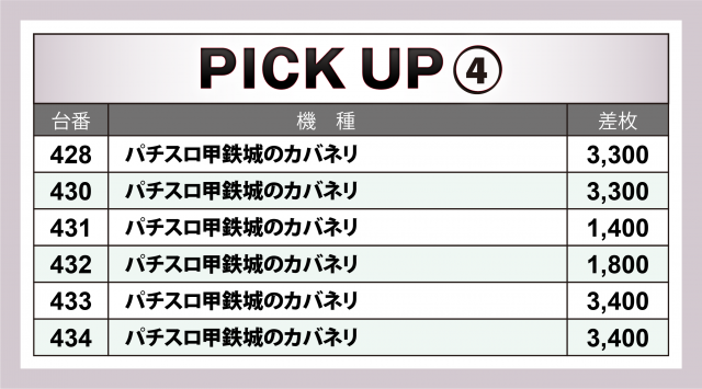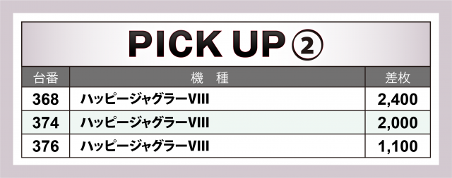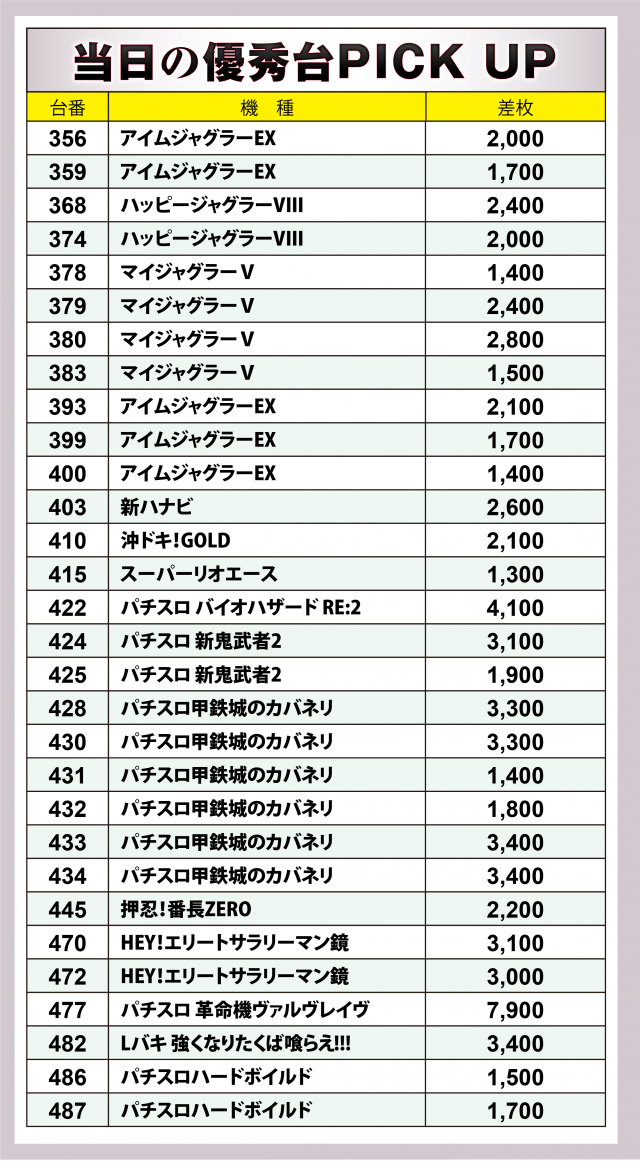 続いては好調4機種計19台をチェック。19台全てが4桁のプラスを計上し、『パチスロ甲鉄城のカバネリ』は+3千枚超×4で6台トータルで+1万6千枚を突破。その他ではジャグラーシリーズ3機種が堅調を誇り、いずれにも+2千枚オーバーの台が複数見られる結果となった。