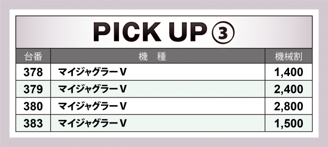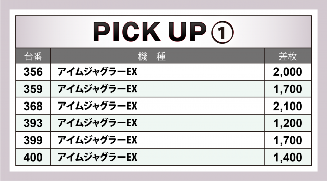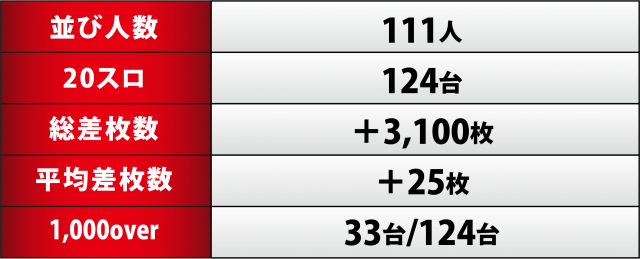 今回、[1000円/46枚] スロ124台のトータルは+3,100枚と、前回に続きプラスとなり連勝を果たしたが些か物足りない数値に。一方、1,000overは全体の4分の1強となり、前回より少し台数を下げたものの、高水準を維持した。内容は決して悪くはないだけに、次回は白星を重ねると共に、圧倒的な差枚数での勝利を目指したいところだ。