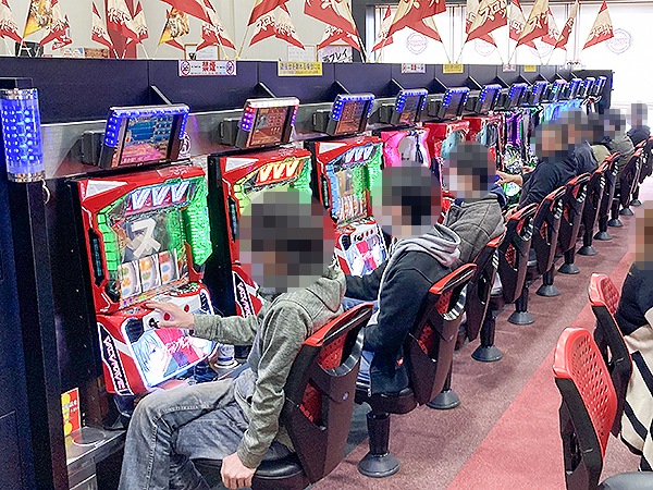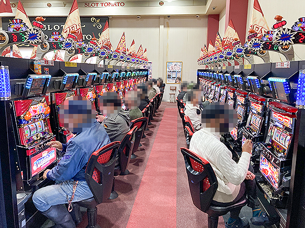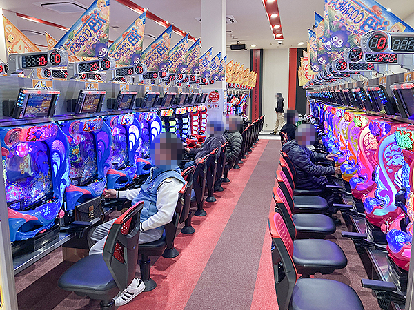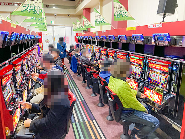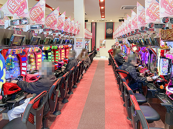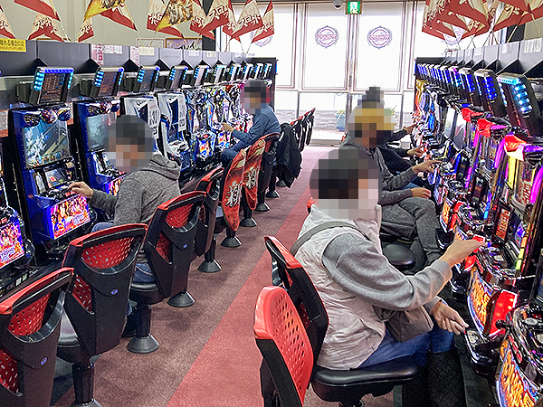 取材時は多くのプレイヤーが来店。パチンコ・パチスロともに、様々な機種が支持されていた。