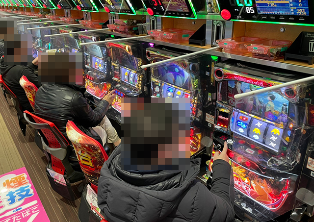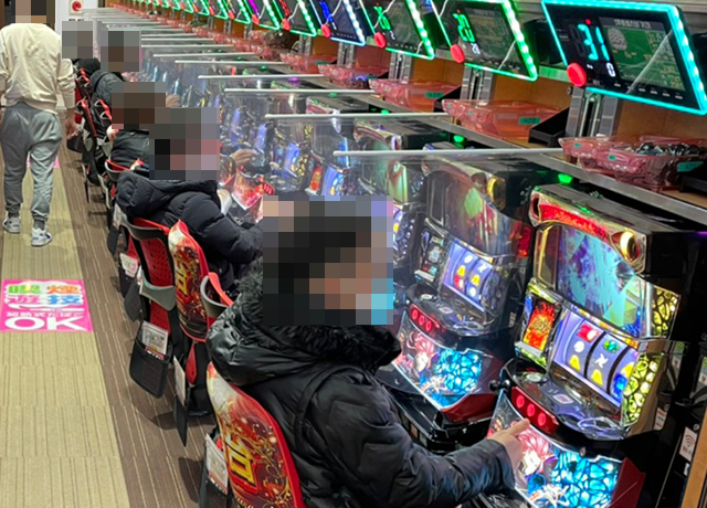 夕方頃のパチスロコーナーには、多くのプレイヤーが集合。