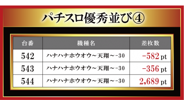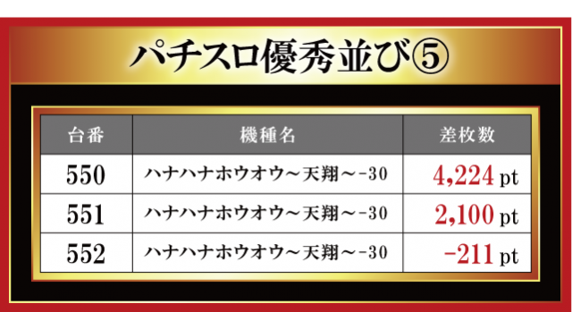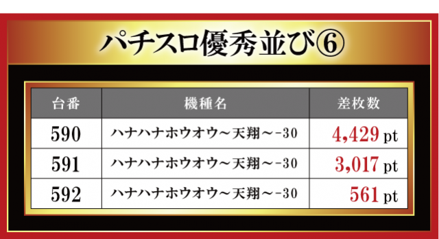 恒例となった月イチ実施の「はねバト!」。2023年初となる2月1日に実施された「菰野店」の優秀台をお伝えしていこう。「菰野店」は『ハナハナホウオウ~天翔~-30』の3台並びが数多い。前回もそうだったが、今回も4箇所あり、差枚数的に高設定と思わしき台もある。まさに主力機種と言えよう。今後はまず『ハナハナホウオウ~天翔~-30』から狙ってみてもいいかもしれない。