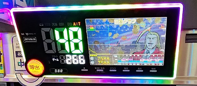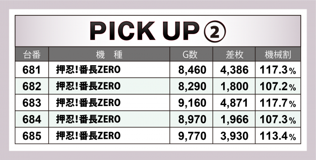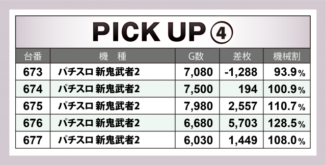 続いては当日横並びで好調だった4機種計19台に迫ろう。まず注目は『HEY!エリートサラリーマン鏡』6台。全台プラス&+7千枚目前の台をトップに合計で+1万4千枚オーバーを達成。次いで『押忍!番長ZERO』5台は全てが4桁プラスを実現&+4千枚クラス×3でトータル+1万7千枚弱となった。また、『パチスロ 新鬼武者2』では+6千枚に迫る台を輩出した。
