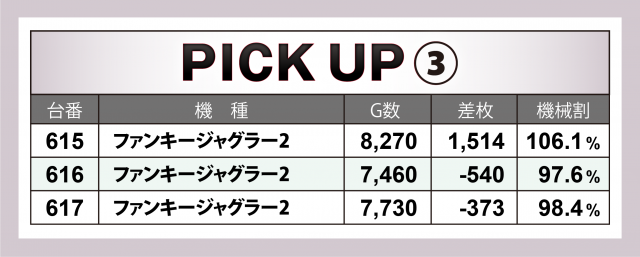今回、[1000円/47枚]スロ241台のトータルは+18,328枚と、当取材では初のプラスを成し遂げ、納得の結果となった。また1,000overは前回よりも台数を5伸ばして全体の約2割となり、他店取材と比較しても引けを取らないレベルで終えることができた。これからは、次々と白星を量産できるかと共に、今後はさらなる差枚数アップにも期待したいところだ。