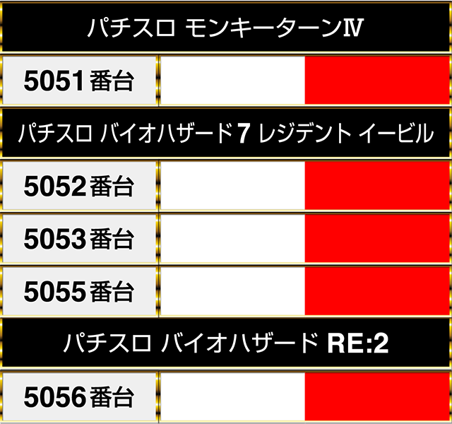 『パチスロ モンキーターンⅣ』の5051番台から『パチスロ バイオハザード RE:2』の5056番台までが並んでプラスpt!!
