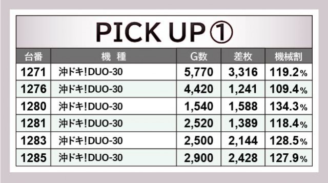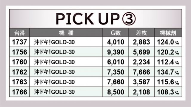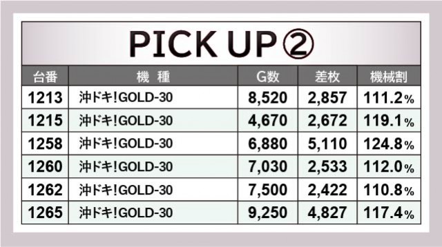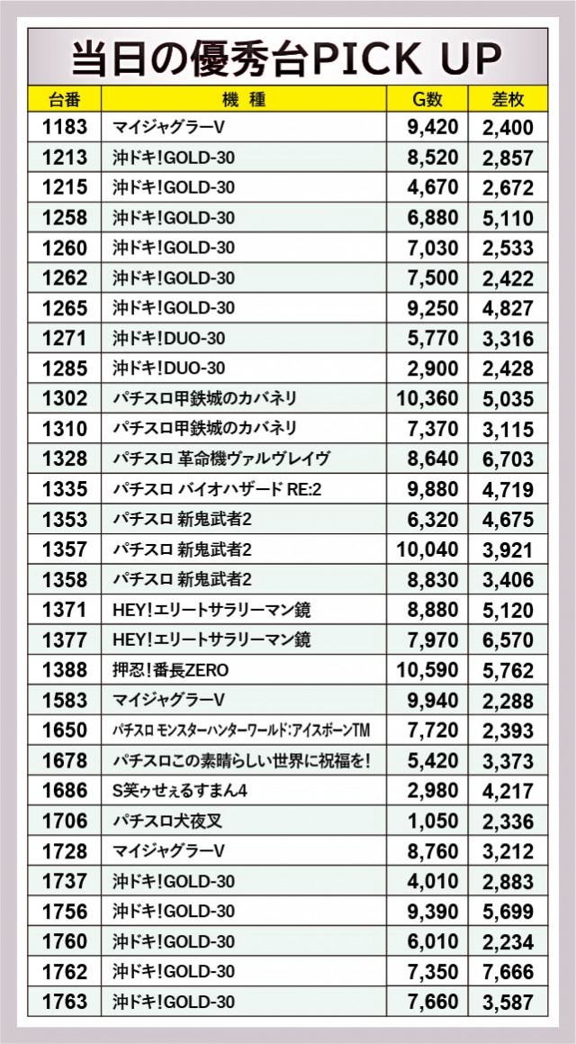 シリーズ最新機『沖ドキ!GOLD-30』ばかりではなく、『沖ドキ!DUO-30』もまた、しっかりと結果を残した機種だ。回転数こそ物足りなさを感じるが、それでも上表の6台がプラス差枚を築き、盛り上がりに貢献している。対して『沖ドキ!GOLD-30』は1756番台+5,699枚・1762番台+7,666枚を筆頭に、まとまった出玉を放出した台が多く見られた。沖スロ設置台数が大きい同店であるため、今後もファン諸氏は注目する必要があるのは間違いない。