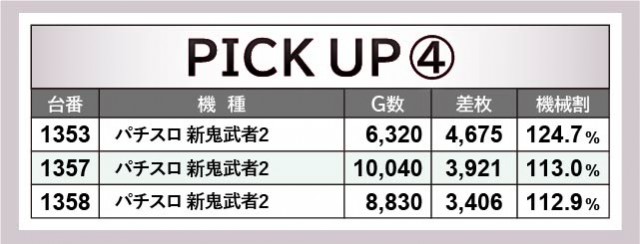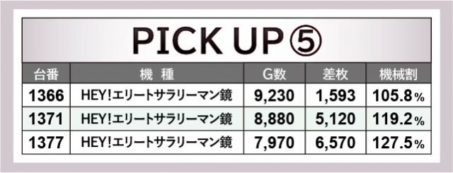 『パチスロ 新鬼武者2』から万回転OVERを確認でき、加えて差枚数に関しても、1353番台+4,675枚という記録を残した。回転数と差枚数が比例するような展開は、遊技するファンにとって自信を深めるには十分だっただろう。また『HEY!エリートサラリーマン鏡』も同様で、1371番台+5,120枚・1377番台+6,570枚という数字は、同機種のポテンシャルがしっかりと引き出された格好と言えるはずだ。