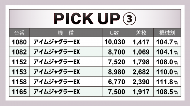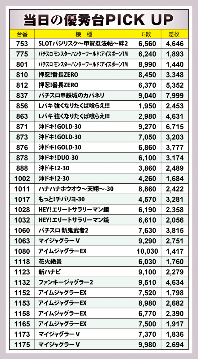 まずは優秀30台のPICK UPから。前回に引き続き、30台のうち22台が差枚数+2千枚以上を達成、+3千枚以上は12台、+4千枚オーバーは6台となった。後述する好調3マシン以外でのハイスコアを成し遂げたのは、+8千枚間近の『パチスロ甲鉄城のカバネリ』・+5千枚突破台をトップに2台で+9千枚目前の『押忍!番長ZERO』・+5千枚に迫った『ファンキージャグラー2』・+5千枚弱の台を筆頭に2台合わせて+7千枚超の『Lバキ 強くなりたくば喰らえ!!!』といった4機種。その他でもドル箱使用台が数々見受けられた。