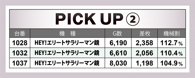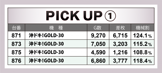 続いては好調4機種計13台をチェック。その13台の全てが4桁プラスを計上、注目は最近の取材でもハイスコアを続ける『沖ドキ!GOLD-30』。今回は+7千枚到達間近×1&+3千枚超×2で4台の合計が+1万5千枚目前に迫った。 また、『HEY!エリートサラリーマン鏡』は3台で+5千5百枚超を達成、さらには6台トータルで+1万1千枚弱の『アイムジャグラーEX』が安定の結果を残した。