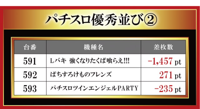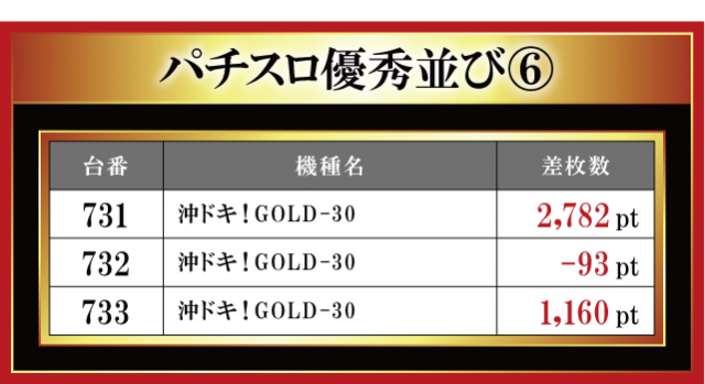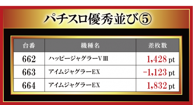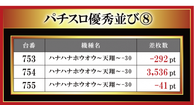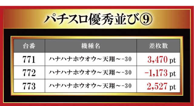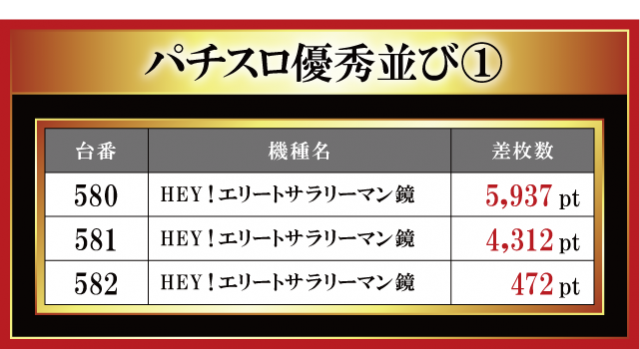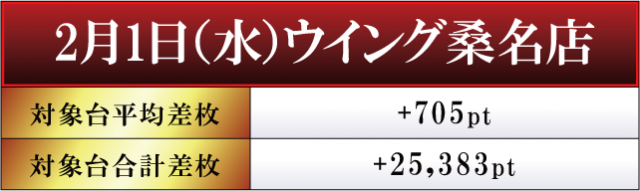 恒例となった月イチ実施の「はねバト!」。2023年初となる2月1日に実施された「桑名店」の優秀台をお伝えしていこう。ビッグな差枚数で注目を浴びたのが『HEY!エリートサラリーマン鏡』だ。580番台から5,937枚、581番台から4,312枚と申し分ない差枚数となった。また、ウイングならではの沖スロコーナーも盛んだ。『沖ドキ!GOLD-30』から731番台と737番台。『ハナハナホウオウ~天翔~-30』から754番台と771番台が3000枚前後のプラスとなった。