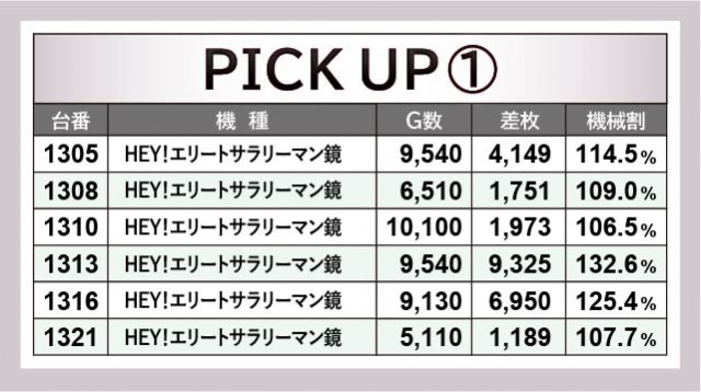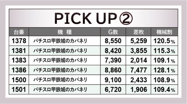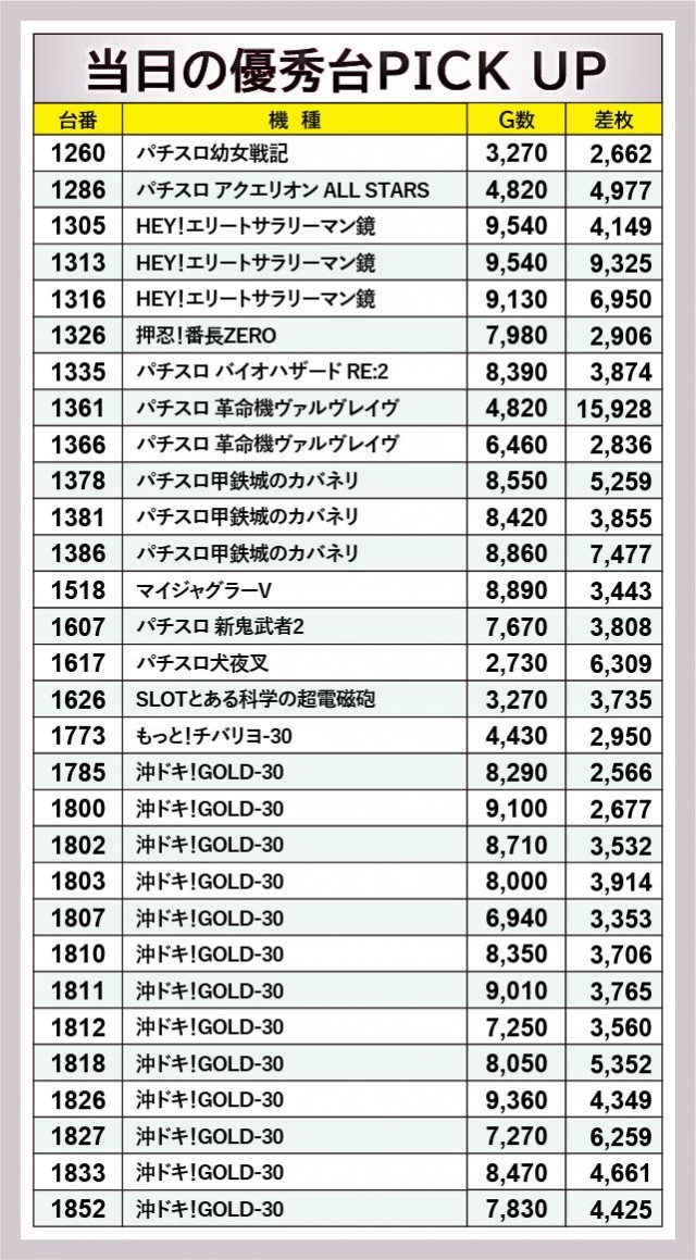 『パチスロ 革命機ヴァルヴレイヴ』1361番台+15,928枚という大記録が生まれており、同機種の高いポテンシャルには驚きを隠し切れない。その他にも『HEY!エリートサラリーマン鏡』1313番台+9,325枚や『パチスロ甲鉄城のカバネリ』1386番台+7,477枚など、各所で突出した記録を確認できる。また『沖ドキ!GOLD-30』は各所で好記録が飛び出しており、同店の看板機種がしっかりと結果を残したことは、ファン諸氏にとって大きな安心感を覚えたことだろう。