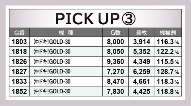『HEY!エリートサラリーマン鏡』『パチスロ甲鉄城のカバネリ』『沖ドキ!GOLD-30』の3機種は、いずれも同店に大量設置されている人気機種である。これらはいずれも朝から閉店までじっくりと打ち込まれており、ファン諸氏が手ごたえを感じるまで、多くの時間を必要としなかったかもしれない。特に『沖ドキ!GOLD-30』は3千枚OVERが目立ち、1827番台+6,259枚のような大きな記録も生まれているため、有意義な時間を過ごせたことだろう。