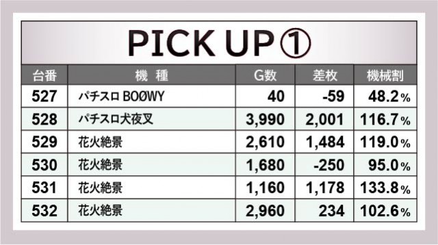 86~91番台・527~532番台・536~541番台・587~892番台の計4ヶ所は、6台横並びでの好況スポットを形成していた。各所で回転数不足が否めないが、それでも『パチスロ 真俺の空』539番台+4,740枚や『パチスロ幼女戦記』537番台+2,804枚、『SLOT劇場版 魔法少女まどか☆マギカ[前編]始まりの物語/[後編]永遠の物語』591番台+3,286枚や『パチスロ 魔法少女育成計画』87番台+3,820枚といった記録を残している。いずれのエリアも大きなマイナスとはないっていないため、より多くの回転数が刻まれれば、大きな熱量を放っていたのは間違いない。
