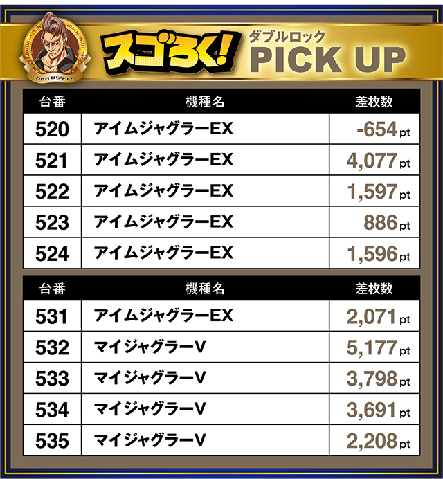 「マイジャグラーV」の3台は3,000ptを超え、532番台は5,100pt以上と好記録だ。
