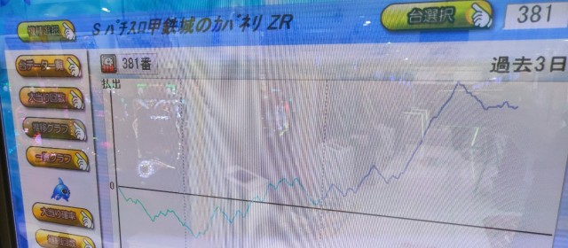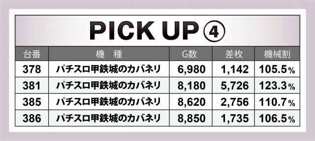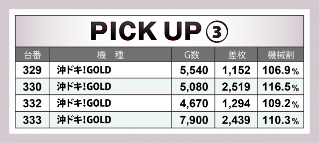 続いては計14台好調4機種について。まず注目は『パチスロ甲鉄城のカバネリ』で、+6千枚弱の台をトップに4台トータルで+1万1千枚超を達成。また『沖ドキ!GOLD』は4台全てが4桁プラス&その合計は+7千枚オーバーをマークした。