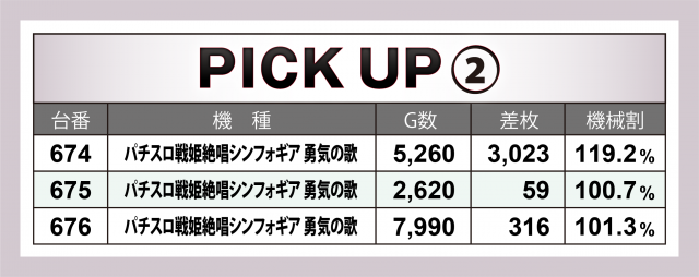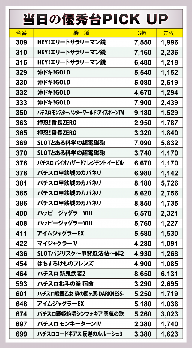 まずは優秀30台のPICK UPから。この日は30台のうち11台が差枚数+2千枚以上を達成、+3千枚以上が4台となった。以下に挙げる好調4機種以外でハイスコアを残したのは+6千枚オーバーを記録した『パチスロ 新鬼武者2』・+6千枚に迫った『SLOTとある科学の超電磁砲』の2マシンを筆頭に、3台の合計で+5千枚を突破した『HEY!エリートサラリーマン鏡』が後に続いた。