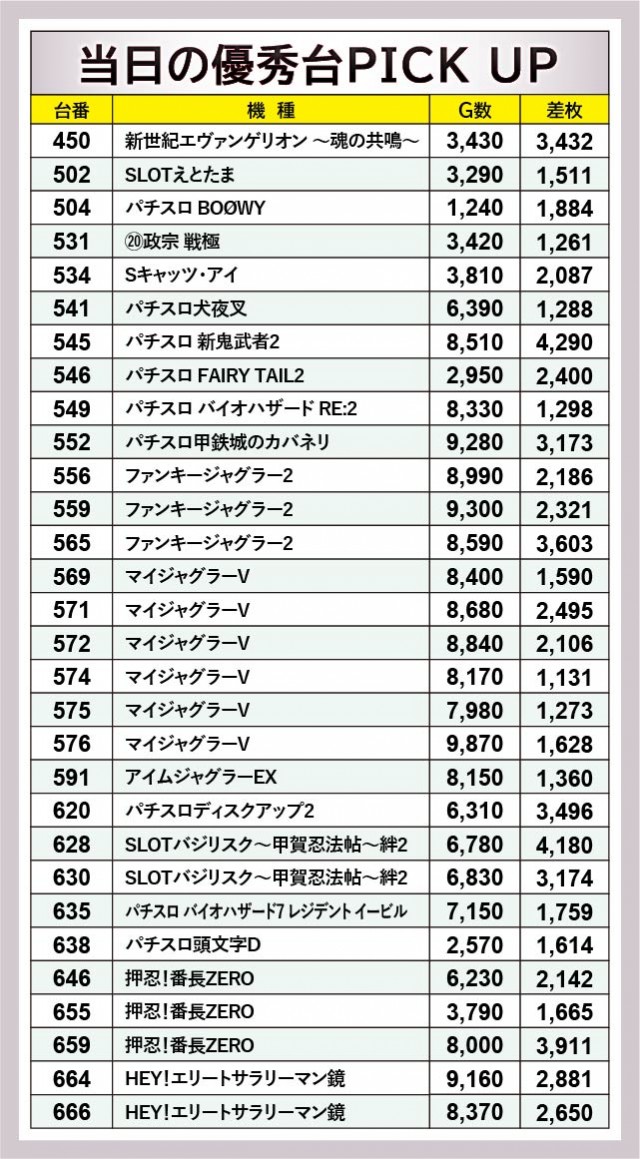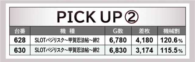上表の中段あたりに並んだ『ジャグラー』シリーズの名前に目を奪われるばかりで、それぞれ8~9千回転台を記録しているのも鮮烈だ。各台でまとまった出玉を獲得しており、GOGOランプの輝きに癒されるファンの様子が容易に想像できる。また差枚数に着目すると、『パチスロ 新鬼武者2』545番台+4,290枚や『SLOTバジリスク~甲賀忍法帖~絆2』628番台+4,180枚といった記録が発生。他にも3千枚OVER台を確認でき、店内各所にて熱気を感じることができたに違いない。
