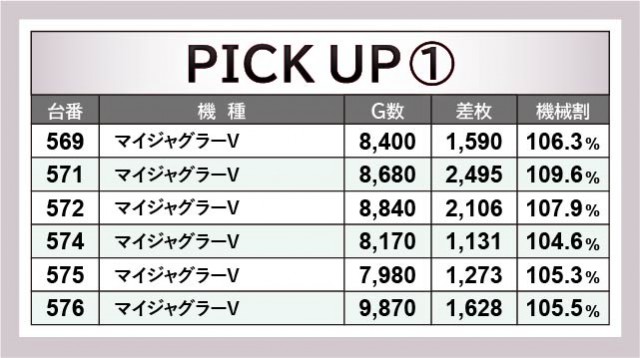 まずは『マイジャグラーV』から取り上げるが、やはり人気機種だけあって、朝から閉店までじっくりと打ち込まれた形跡が見られる。571番台+2,495枚や572番台+2,106枚など、回転数と差枚数が比例する展開は、遊技していたファンの口角が上がっていたと断言できる部分だ。レバーを叩く力も強くなり、有意義な時間を過ごせた一角なのは確かだ。