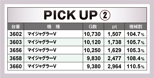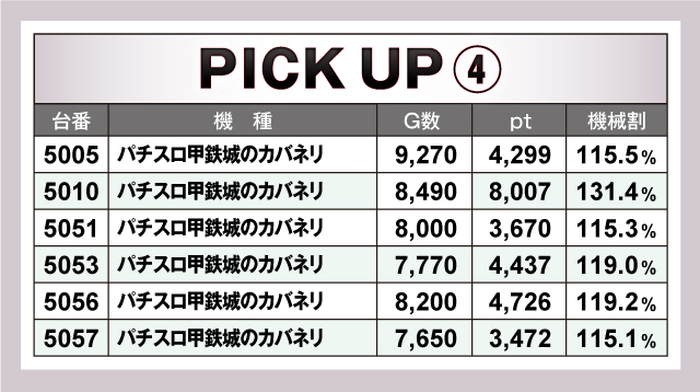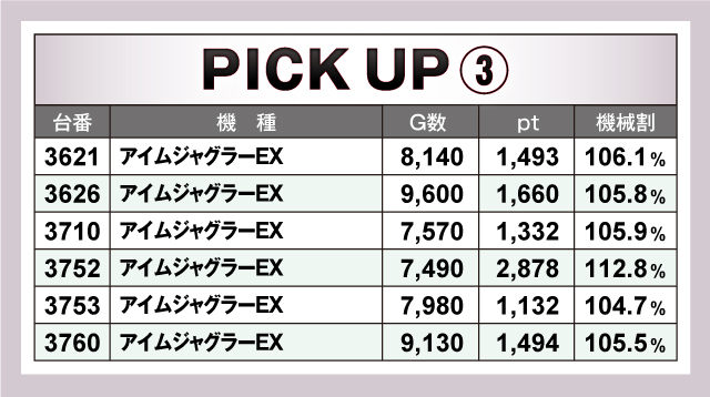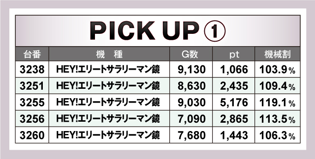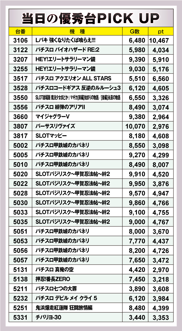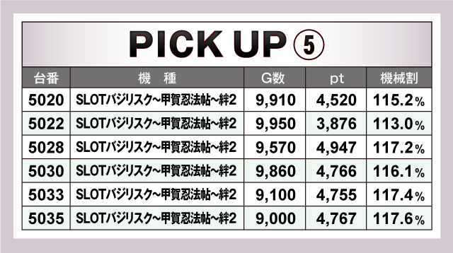 続いては、とくに注目すべきピックアップ5機種を紹介していこう。ピックアップ全台のptが4ケタを超えており、「HEY!エリートサラリーマン鏡」「パチスロ甲鉄城のカバネリ」からは+5,000ptオーバーの記録をマーク。また、ジャグラーシリーズや「SLOTバジリスク~甲賀忍法帖~絆2」は、どの台もしっかり回されていたことから、期待値十分の良台ばかりだった可能性が高そうだ!