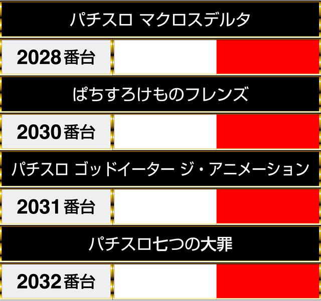 バラエティコーナーでは、2028番台の『パチスロ マクロスデルタ』から2032番台の『パチスロ七つの大罪』までが並んでプラスptを記録!