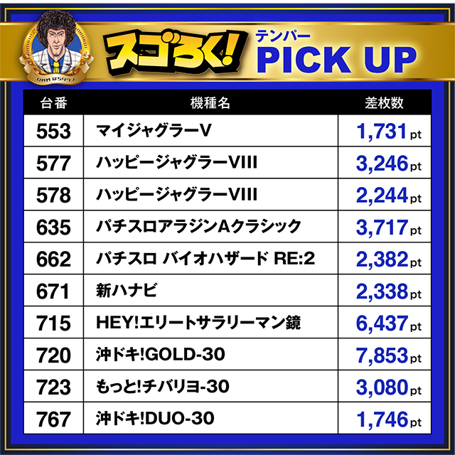「ハッピージャグラーVIII」では577番台と578番台に3,246ptと2,244が並ぶ結果に!