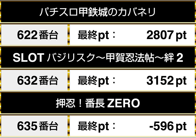 『パチスロ甲鉄城のカバネリ』の622番台は2807pt、『SLOTバジリスク~甲賀忍法帖~絆2』の632番台は3152ptを記録!
