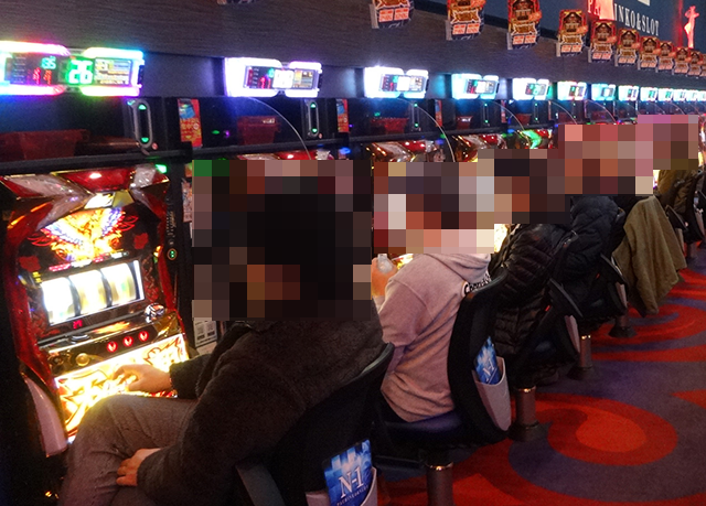 多くのプレイヤーが集まる店内は、パチンコとパチスロの両方が盛況。