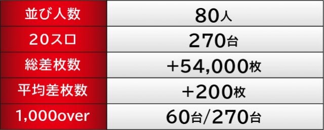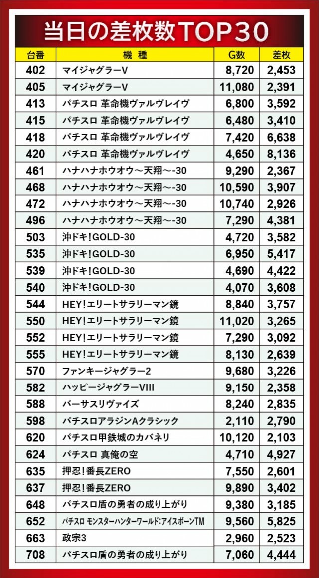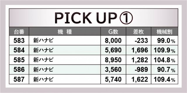 優秀台に目を奪われがちだが、ここでは『新ハナビ』に注目したい。同機種は多くのゲーム数が消化されており、全台がポテンシャルを秘めていたと言える。583番台と585番台は8千回転台を記録し、さらに3台がプラス差枚を記ており、遊技していたファンが手応えのほどを理解していたはずだ。大きなマイナスを作っていない部分も特筆すべき部分で、より回転数が伴えば、全台プラス差枚も可能だったのは間違いない。