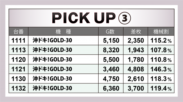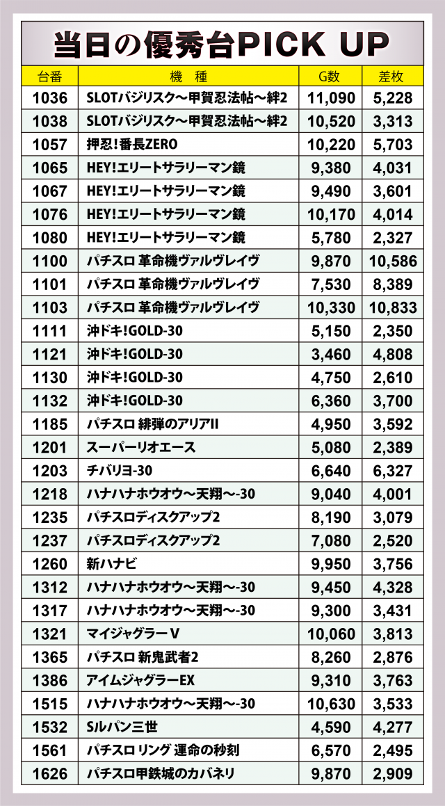 まずは優秀30台のPICK UPから。前回同様に30台全てが差枚数+2千枚以上を達成し、+3千枚以上は全体の7割超となる22台、+4千枚オーバーは12台、+5千枚オーバーは6台と、直近の2回をも超えるハイレベルぶりを見せつけた。後述する好調4機種以外では、+6千枚オーバーの『チバリヨ-30』・+5千枚超えを含む2台で+8千5百枚をマークした『SLOTバジリスク~甲賀忍法帖~絆2』・+6千枚に迫った『押忍!番長ZERO』・+4千枚オーバーを残した『Sルパン三世』といったマシンが華々しい差枚数を叩き出した。