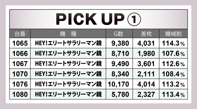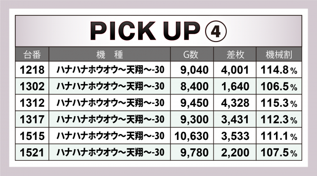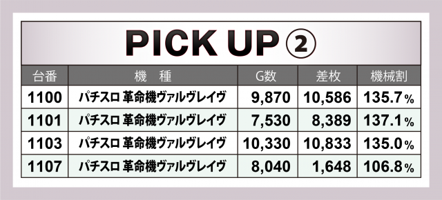 続いては好調4機種計22台を振り返えろう。22台の全てが4桁プラスを成し遂げ、中でも最も注目すべきは『パチスロ 革命機ヴァルヴレイヴ』。+1万枚オーバー×2をツートップに4台のトータルで+3万1千枚を超える差枚数を実現。また 『ハナハナホウオウ~天翔~-30』6台は+4千枚超を2台輩出&合計で+1万9千枚を突破、『HEY!エリートサラリーマン鏡』6台は+4千枚クラス×3&合わせて+1万8千枚超を記録、『沖ドキ!GOLD-30』6台は+5千枚弱を筆頭に合計で+1万4千枚超を達成と、それぞれのマシンが出玉性能を最大限に発揮した。