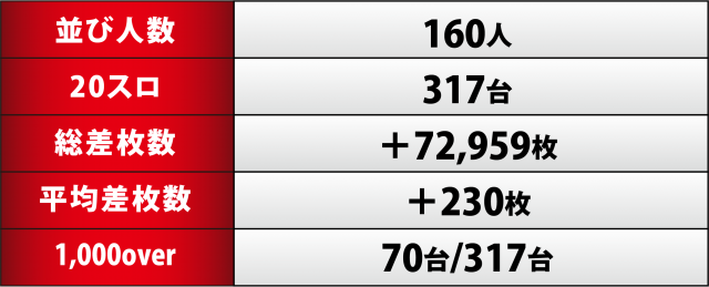 今回、[1000円/46枚]スロ317台のトータルは+72,959枚と、前回が全5回で最高のプラス差枚数を成し遂げていたが、それをも更に上回る成績でフィニッシュを遂げた。また1,000overは前回より2台増え全体の2割強を維持した。さらに、優秀30台の表でもお分かりの通り、当日は1万Gを超えるゲーム数となった台が複数見られ。プレイヤーが粘り抜いて出玉のポテンシャルを引き出したと言えよう。これで同店はトータルプラス6連勝の快進撃。今回の成績を見る限り、次回の取材では+10万枚を超える大記録もあながち夢ではなさそうだ。