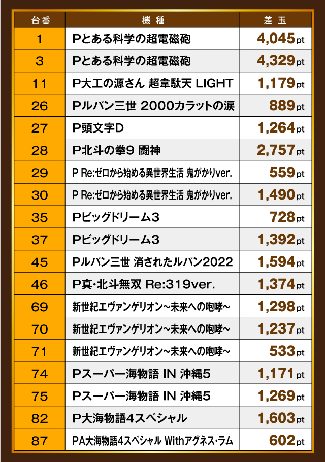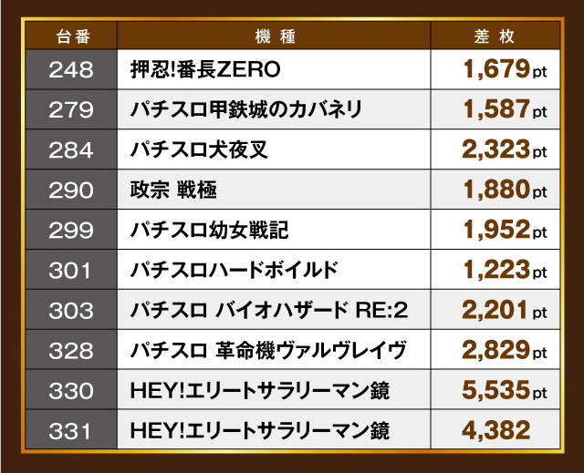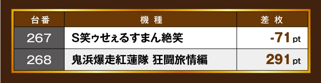 前回、全国制圧を達成した「ウエスタン一之江店」であったが、今回は残念ながら五国制圧となった。それでも各国とも安定した成績を残しており、特に「爆ノ国」では『HEY!エリートサラリーマン鏡』が大活躍! 331番台は+4,300ptオーバー、330番台は+5,500ptオーバーと見事な成績でホールを盛り上げていた。そのポテンシャルを発揮できれば、次回は全国制圧も可能なハズ。次回に期待しよう!!