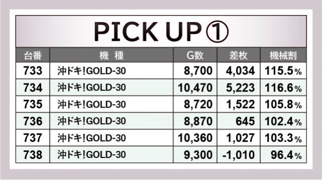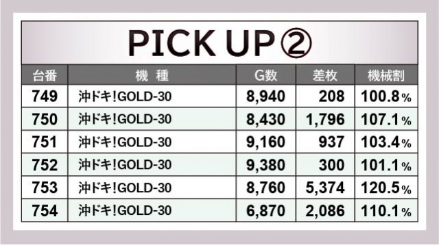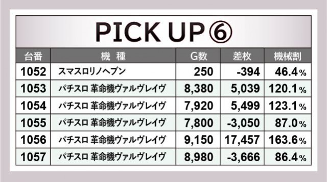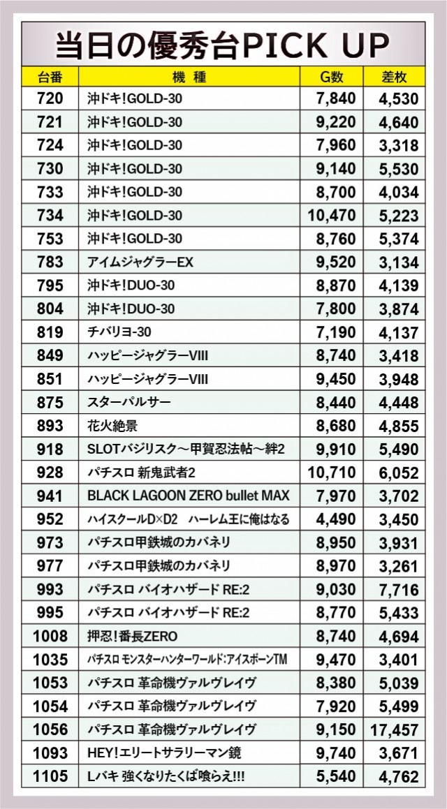 『パチスロ 革命機ヴァルヴレイヴ』1056番台+17,457枚という記録が生まれ、前回に引き続き、今回も同機種から万枚OVERが発生した。スマスロの一撃が鮮烈である一方、『パチスロ 新鬼武者2』928番台+6,052枚・『パチスロ バイオハザード RE:2』993番台+7,716枚という熱気も見られ、負けじと盛り上がりを披露していたのも見逃せない。『沖ドキ!GOLD-30』が数多く名を連ねているのも鮮烈で、何よりも各機種がしっかりと遊技されている点に好感を覚えるばかりだ。