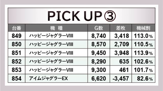 前述したように、『沖ドキ!GOLD-30』は多くの台が朝からずっと打ち込まれていた。733~738番台・749~754番台はプラス差枚を数多く築いたエリアで、734番台+5,223枚・753番台+5,374枚といった大きな熱量を放っていた台を確認できる。また『ジャグラー』シリーズに関しては、『ハッピージャグラーVIII』が注目の的に。849番台+3,418枚・851番台+3,948枚という記録から、ファンが相当な手ごたえを感じていた様子が窺えるだろう。