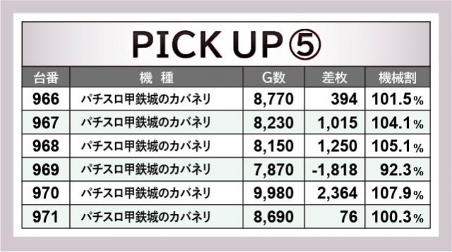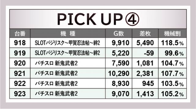 918~923番台・966~971番台・1052~1057番台は、好況スポットを形成していたようだ。その中で大きな記録を築いたのが『SLOTバジリスク~甲賀忍法帖~絆2』918番台+5,490枚、『パチスロ 革命機ヴァルヴレイヴ』1053番台+5,039枚・1054番台+5,499枚となっており、さらには1056番台+17,457枚という驚きの結果も生まれている。『パチスロ甲鉄城のカバネリ』は回転数の多さから好感触を覚えたファンの姿がを想像でき、それは『パチスロ 新鬼武者2』でも同様だったに違いない。