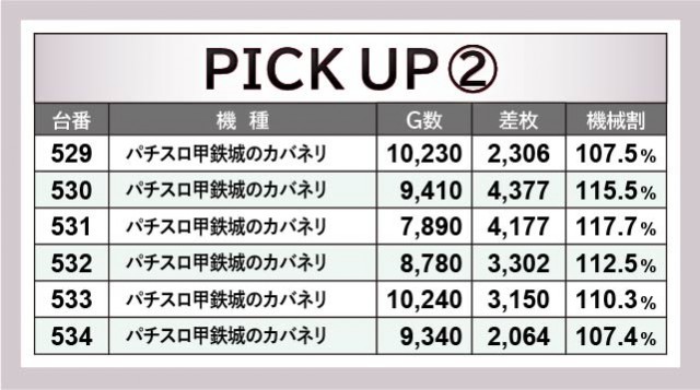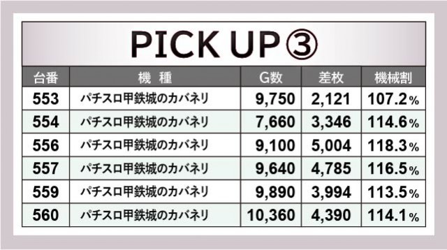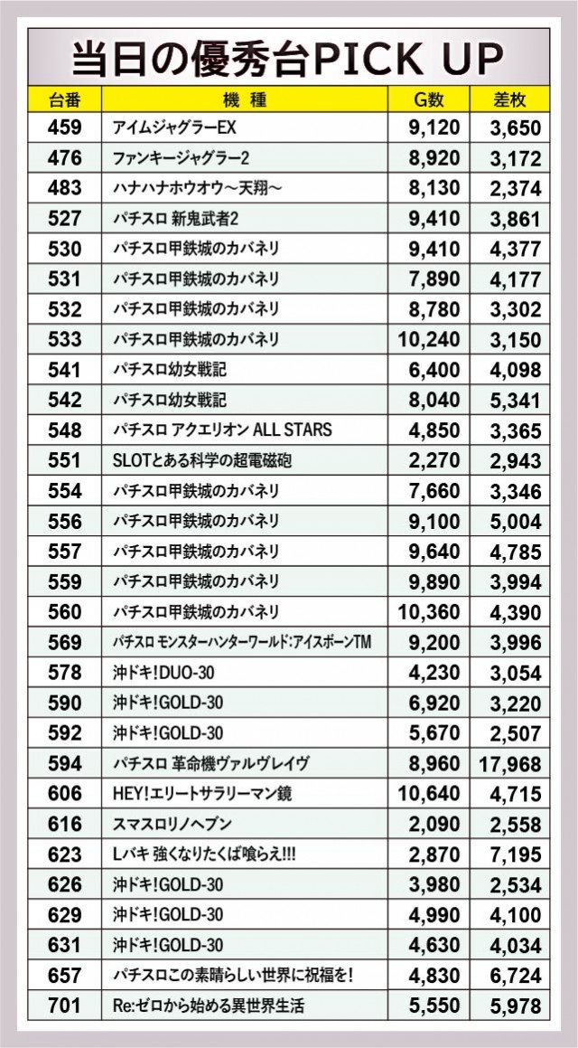 対してAT機は『パチスロ甲鉄城のカバネリ』をピックアップ。こちらも回転数から手ごたえのほどを窺うことができ、力強くレバーを叩いていた様子が容易に想像できるだろう。556番台+5,004枚や557番台+4,785枚など、結果が伴う内容が多数生まれており、今後も同機種の様子をじっくりと見届ける必要があるのは間違いない。