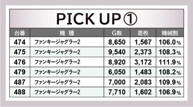 まず『ファンキージャグラー2』に触れるが、いずれもじっくりと打ち込まれた形跡が見られる。476番台+3,172枚という大きな差枚数は、遊技していたファンを笑顔にしたのは間違いなく、他の台に関しても同様のことが言えるだろう。上表の6台は打ち続けていくことによって、期待が確信に変わった様子が手に取るように分かるはずだ。