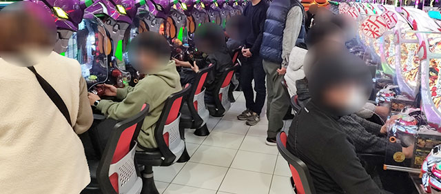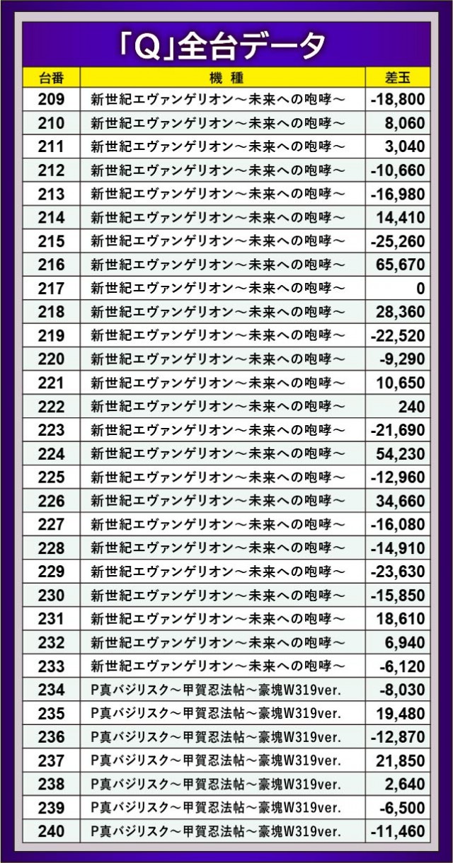 『新世紀エヴァンゲリオン〜未来への咆哮〜』では216番台+65,670玉・224番台+54,230玉など圧倒的な記録が発生しており、ファンから愛される続ける理由が如実に窺える。また新台『P真バジリスク~甲賀忍法帖~豪塊W319ver.』も2万発前後の差玉を確認でき、こちらも追随するように熱気を放っていた。