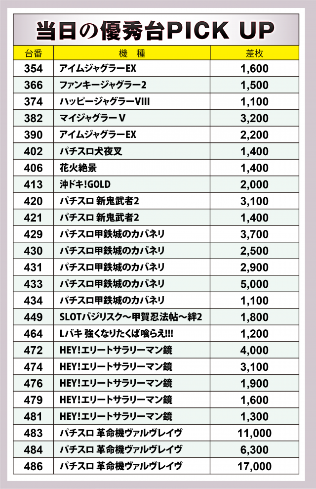 まずは優秀30台のPICK UPから。定例では1,000overをマークした上位30台に迫るのだが、25台に留まったのは残念。25台のうち13台が差枚数+2千枚以上を達成、+3千枚以上は9台、+4千枚オーバーは5台、+5千枚オーバーは4台となった。後述する好調3機種以外で目立ったのが『マイジャグラーⅤ』『パチスロ 新鬼武者2』の2機種で、どちらも+3千枚突破を記録した。