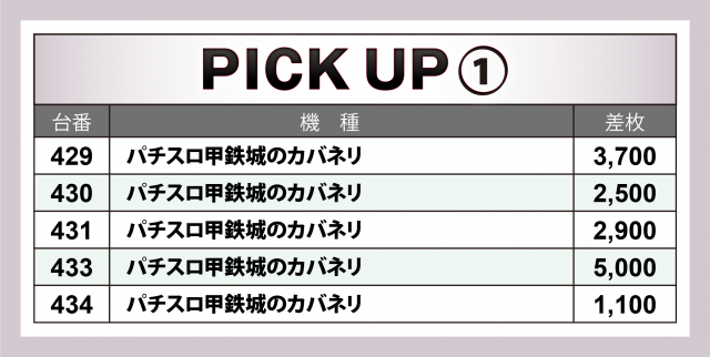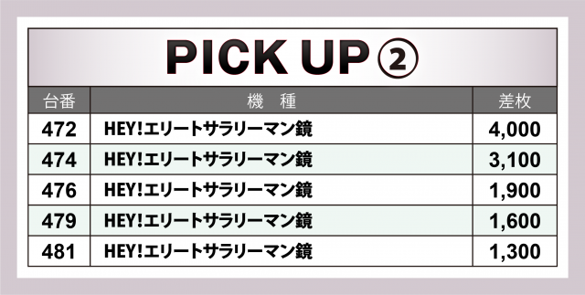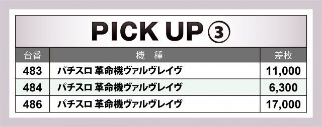 続いては好調3機種13台をチェック。最注目は『パチスロ 革命機ヴァルヴレイヴ』で、+万枚オーバー台×2&+6千枚超×1を輩出し、3台合計で+3万4千枚突破を叩き出した。また『パチスロ甲鉄城のカバネリ』は+5千枚台を筆頭に5台トータルで+1万5千枚超を達成。さらに『HEY!エリートサラリーマン鏡』では+4千枚台をトップに5台合わせて+1万2千枚目前という好記録を連発した。