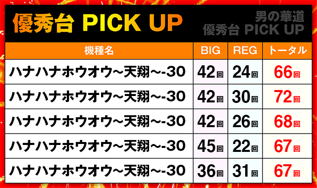 「ハナハナホウオウ~天翔~-30」から選んだ5台のボーナス回数は、どれも65回オーバー。
