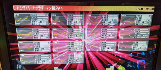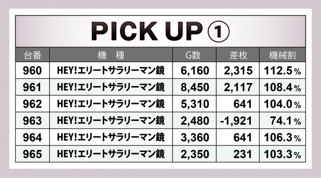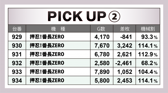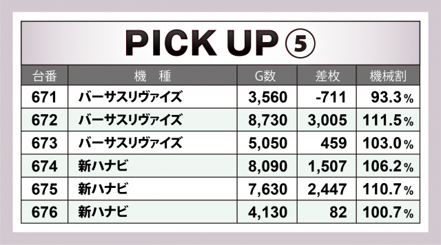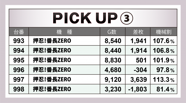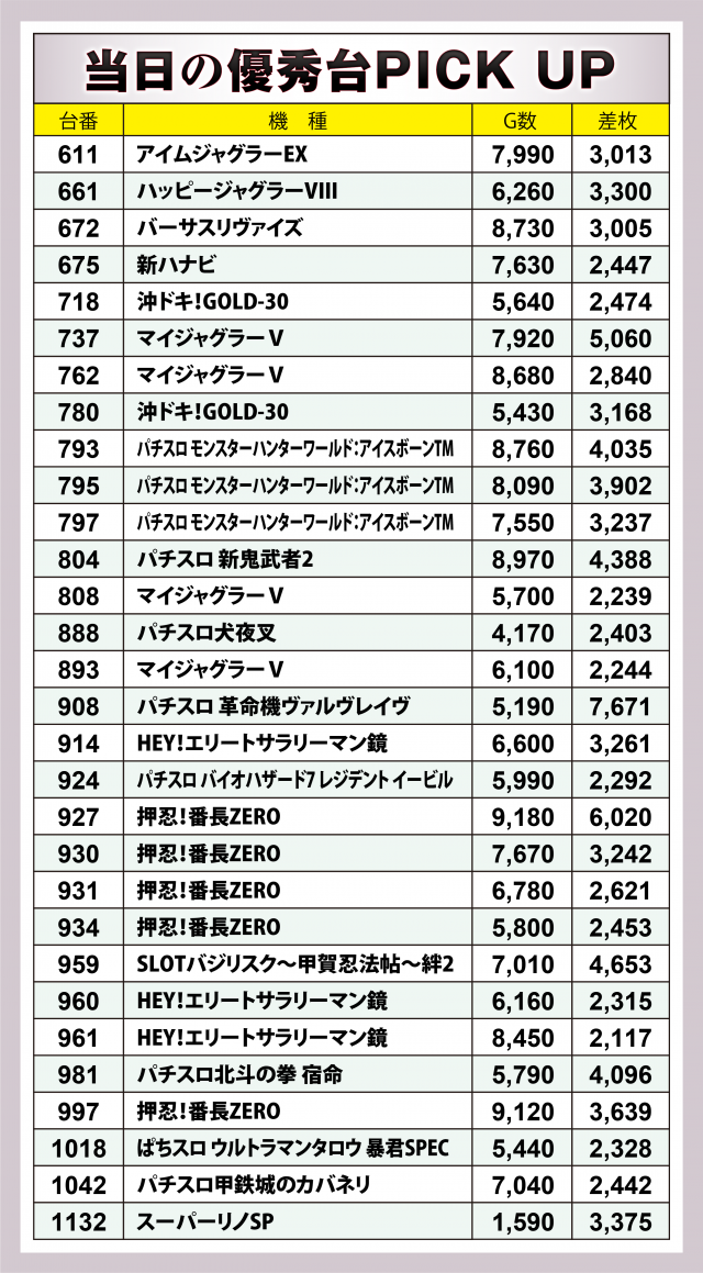 続いては当日横並びで好調だった5機種計30台に注目。特に差枚数上位の台が目立ったのが『押忍!番長ZERO』で、+3千枚超×2&+2千枚クラス×4という好成績となった。また『HEY!エリートサラリーマン鏡』では+2千枚オーバー×2を生み出した。さらに『バーサスリヴァイズ』では+3千枚突破台を輩出した。