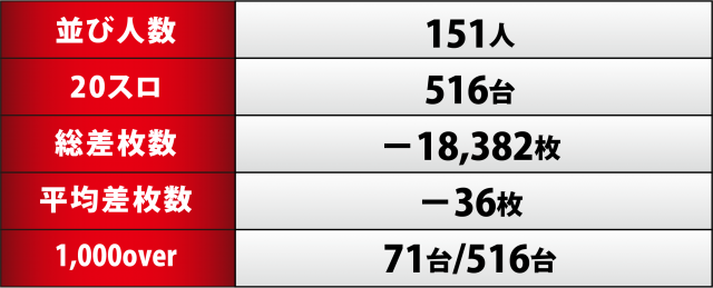 この日、[1000円/46枚]スロ516台のトータル差枚数はマイナス、悔しいことに3連敗という結果に。一方、同店が大型店とあって1,000overは全体の2割を切ってしまい、他店の取材状況と比較すると些か寂しい成績に終わった。次回こそは圧倒的な差枚数でプラスを遂げてもらいたいものだが、そのチャンスは意外に…近い!?