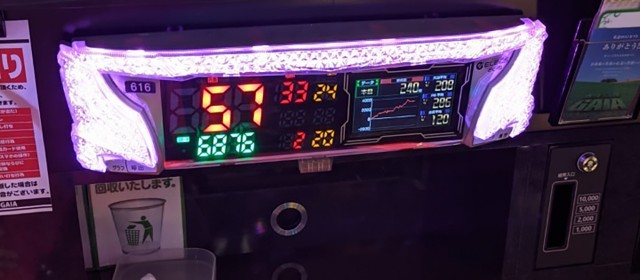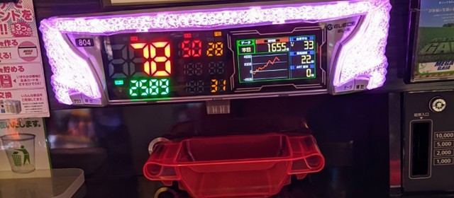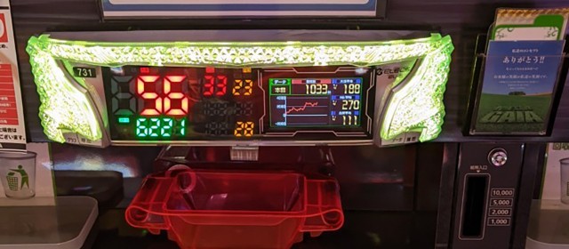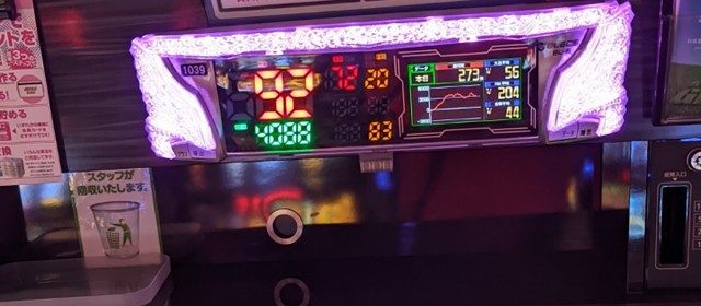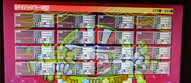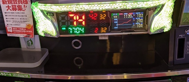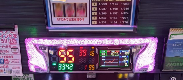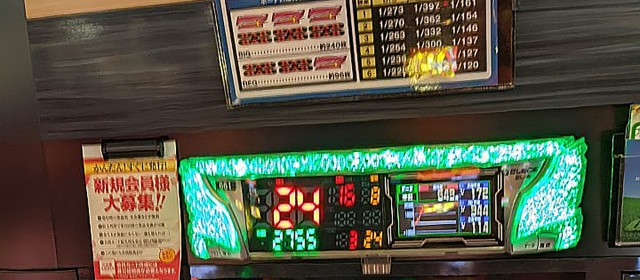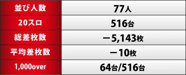 この日、[1000円/46枚]スロ516台のトータル差枚数はマイナス、4連敗を喫してしまったが、数値が前回よりも上向いた点は喜ばしいこと。一方で1,000overの台数は前回と同程度となり、同店が大型店ということから難問であろうが、こちらはもっと数を増やして欲しかった。差枚数が伸びたという事実は明るい好材料であり、次回こそは5連敗を阻止してV字回復を成し遂げてもらいたい。