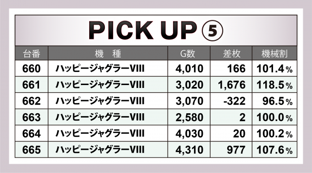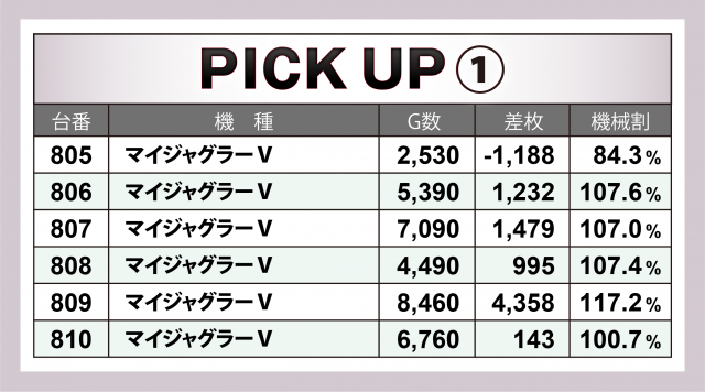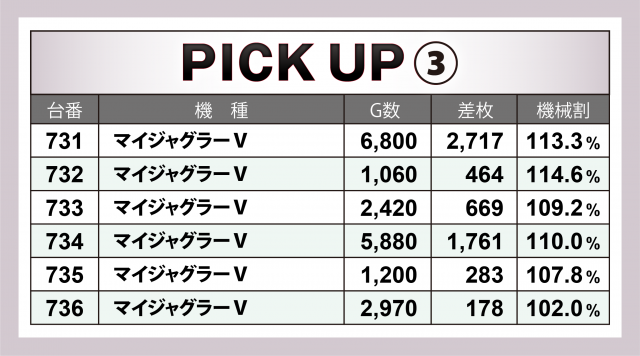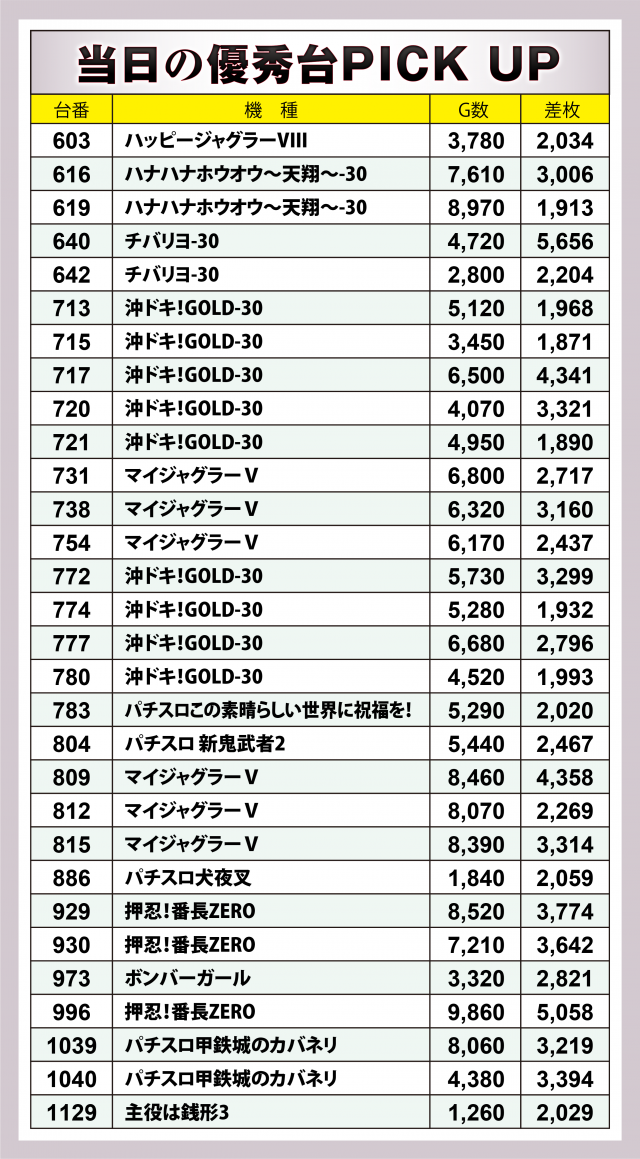 続いては当日横並びで好調だった3機種計29台に注目。17台が対象になったのが『マイジャグラーⅤ』で、+4千枚突破×1&+3千枚クラス×2という好成績を残した。また『沖ドキ!GOLD-30』6台は全台プラス&+4千枚オーバーを筆頭にトータル+1万3千枚超をマーク。