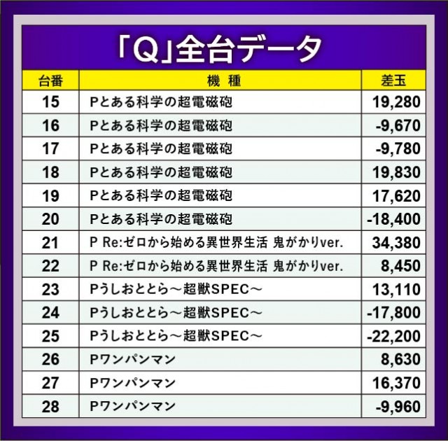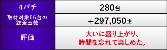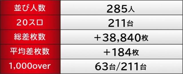 『P Re:ゼロから始める異世界生活 鬼がかりver.』21番台+34,380玉という突出した記録が生まれれば、『Pとある科学の超電磁砲』にて2万発に匹敵する出玉が確認できる。また『Pうしおととら~超獣SPEC~』『Pワンパンマン』でも万発オーバーが発生し、島の各機種から大きな熱量が見られた。