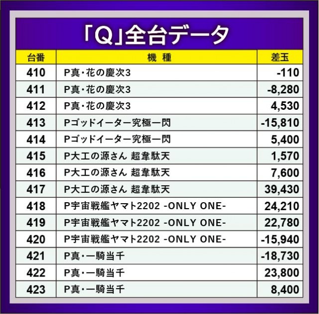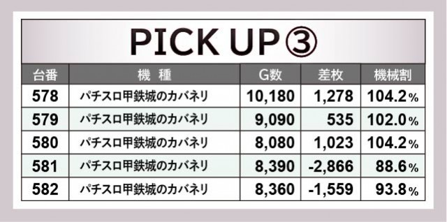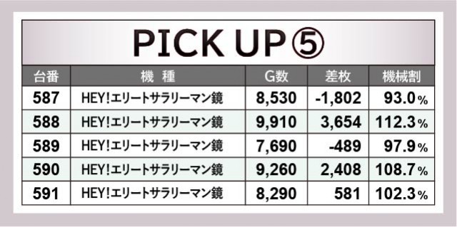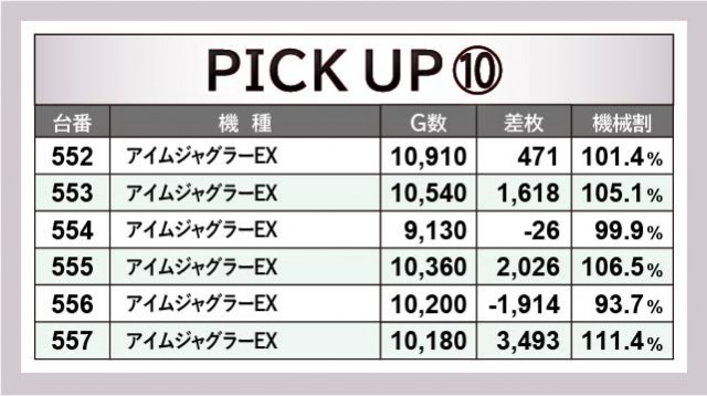やはり『ジャグラー』シリーズの存在感は見過ごすことができず、数多くの万回転OVERが発生した状況は、常連客を中心とした多くのファンが、同店の実力などを把握している故であるからだろう。またAT機に目を向けると、『ボンバーガール』601番台+5,496枚や『パチスロ アクエリオン ALL STARS』610番台+4,896枚といった記録が生まれており、特定の機種に偏らない活躍が見られた点に好感を覚えるばかりだ。