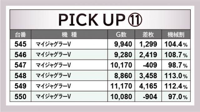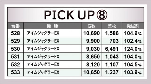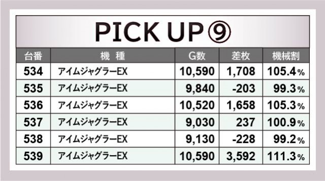 そして『アイムジャグラーEX』『マイジャグラーV』の活躍に触れていくと、見事なまでに回転数と差枚数が比例するような台が見られた。530番台+6,491枚・539番台+3,592枚・557番台+3,493枚・548番台+3,458枚・549番台+4,165枚など、大きなプラスが創造されており、遊技していたファンは同店の『ジャグラー』がもっと好きになったに違いない。