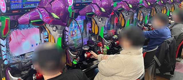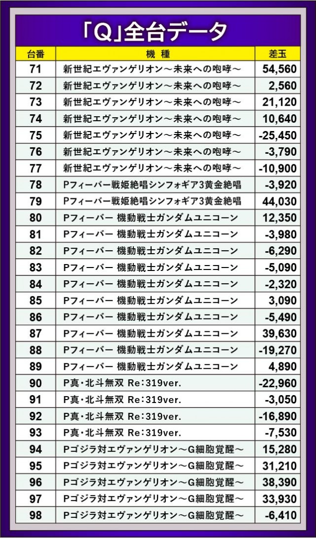 一方で『新世紀エヴァンゲリオン〜未来への咆哮〜』71番台+54,560玉、『Pゴジラ対エヴァンゲリオン〜G細胞覚醒〜』96番台+38,390玉という記録が発生。さらに『Pフィーバー 機動戦士ガンダムユニコーン』87番台+39,630玉、『Pフィーバー戦姫絶唱シンフォギア3黄金絶唱』79番台+44,030玉といった数字が見られ、71~98番台の島では店内随一となる熱気が放たれていた。