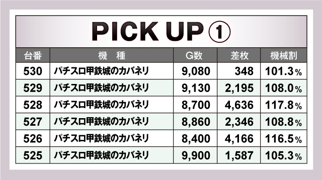 続いてはピックアップ3機種を紹介していこう。「パチスロ甲鉄城のカバネリ」「押忍!番長ZERO」「マイジャグラーV」の3機種それぞれが終日高稼働状態で、4ケタを超える差枚がズラリ。ファンから人気の高い機種に楽しめる要素を散りばめられてたことが窺えた。同店で楽しみたいなら、これらのことを踏まえて立ち回ってほしい!