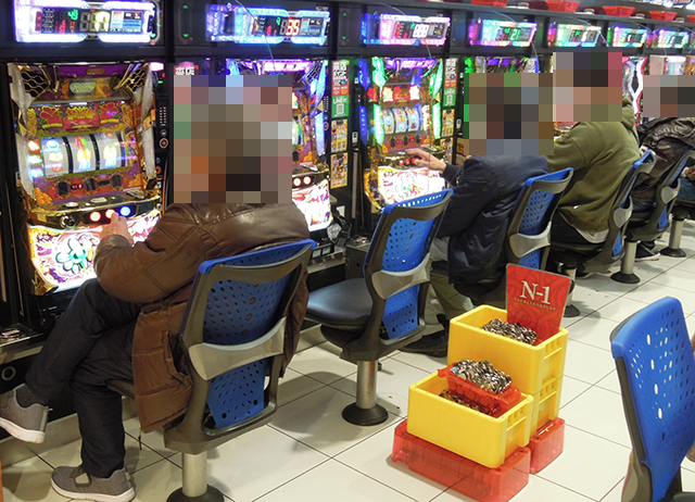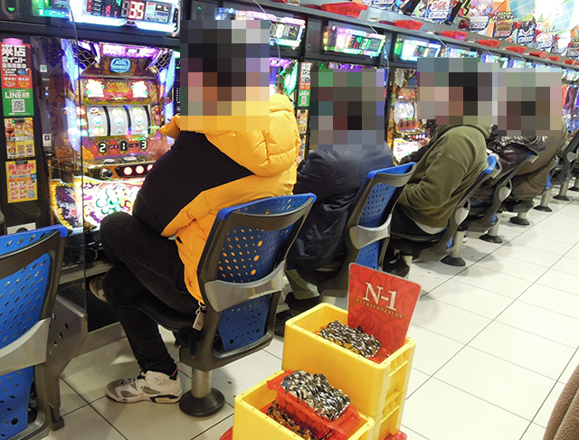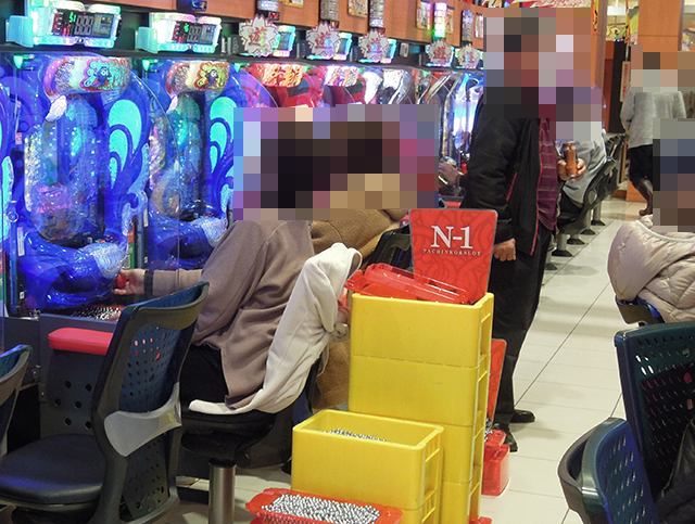 14時半ごろにはすべての台が埋まっており、5箱と2箱の持ち玉で遊技をおこなっているプレイヤーがいた。
